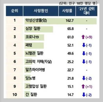 2022년 통계청 자료만 살펴보더라도 인구 10만 명당 암 사망자가 162명, 심장질환 사망자는 65명, 뇌혈관질환 사망자가 49명에 달하는 수준인데, 당시 코로나로 인한 사망자가 그렇게 많았음에도 암, 심장질환 사망자는 더 많았다는 것을 알 수 있습니다.